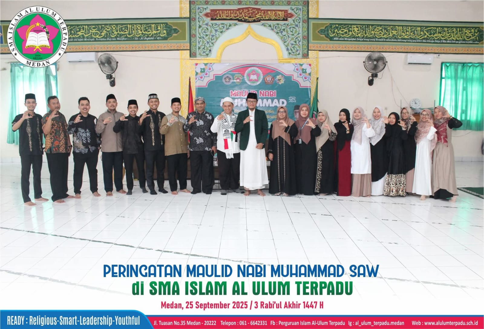 SMA Islam Al-Ulum Terpadu Medan dengan penuh khidmat melaksanakan peringatan Maulid Nabi Muhammad SAW 1447 H / 2025 M pada hari Kamis, 25 September 2025. Kegiatan ini diselenggarakan sebagai wujud kecintaan dan penghormatan kepada Rasulullah SAW, sekaligus mengenang akhlak mulia dan perjuangan beliau dalam menyebarkan ajaran Islam.