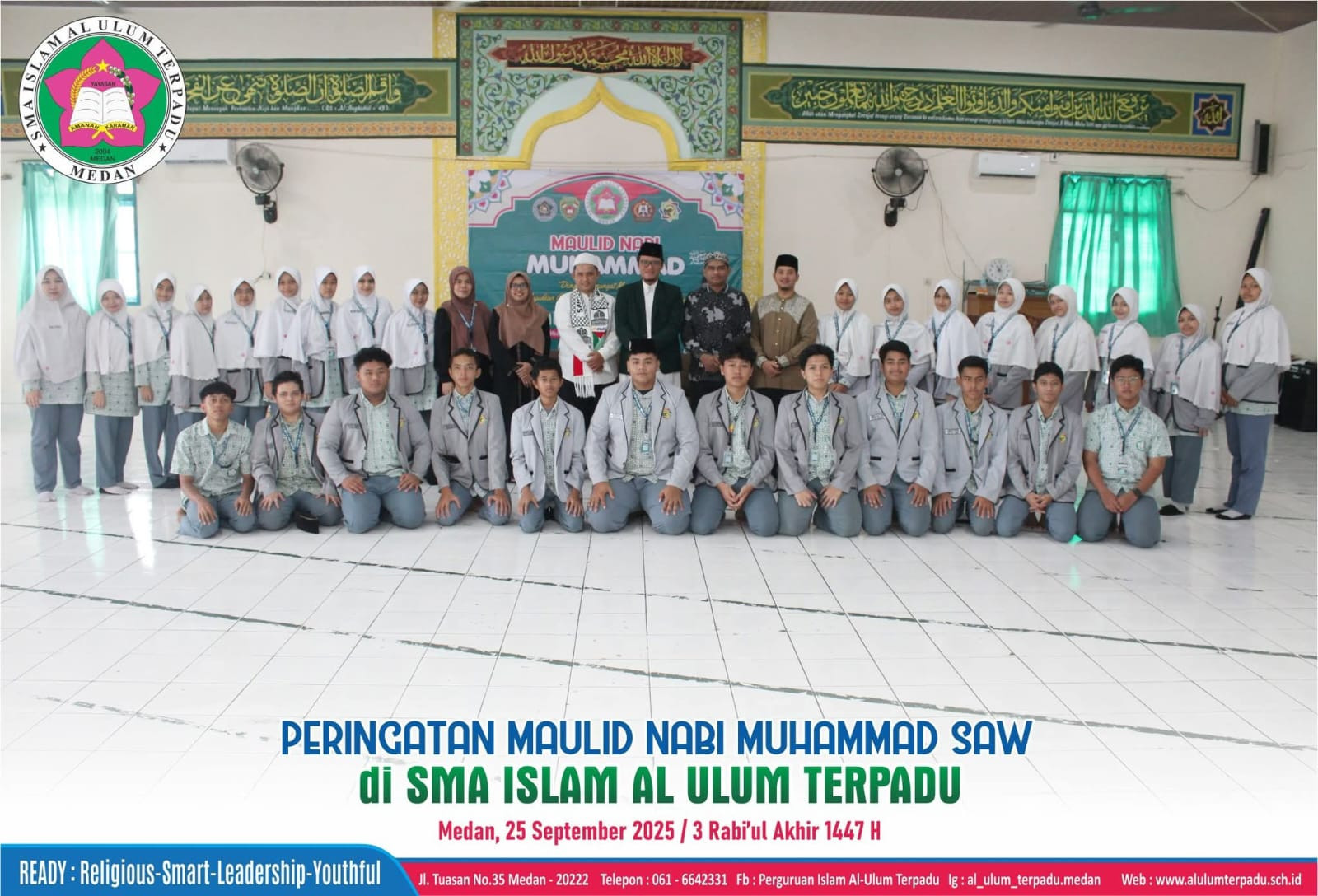 SMA Islam Al-Ulum Terpadu Medan dengan penuh khidmat melaksanakan peringatan Maulid Nabi Muhammad SAW 1447 H / 2025 M pada hari Kamis, 25 September 2025. Kegiatan ini diselenggarakan sebagai wujud kecintaan dan penghormatan kepada Rasulullah SAW, sekaligus mengenang akhlak mulia dan perjuangan beliau dalam menyebarkan ajaran Islam.
