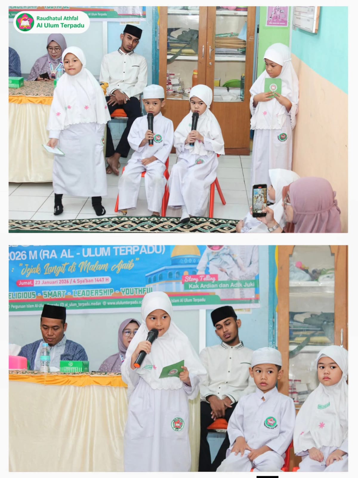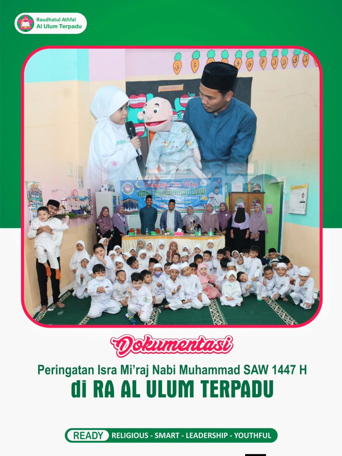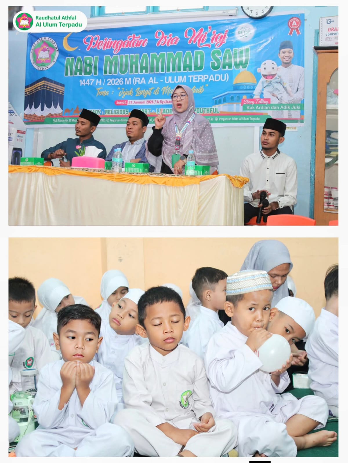 RA Al-Ulum Terpadu dengan penuh khidmat mengadakan acara Peringatan Isra' Mi'raj Nabi Muhammad SAW 1447 H pada Jum'at, 23 Januari 2026. Kegiatan ini bertujuan untuk mengenalkan kepada anak-anak didik tentang peristiwa bersejarah perjalanan Nabi Muhammad SAW dari Masjidil Haram ke Masjidil Aqsa (Isra') dan dilanjutkan ke Sidratul Muntaha (Mi'raj).
