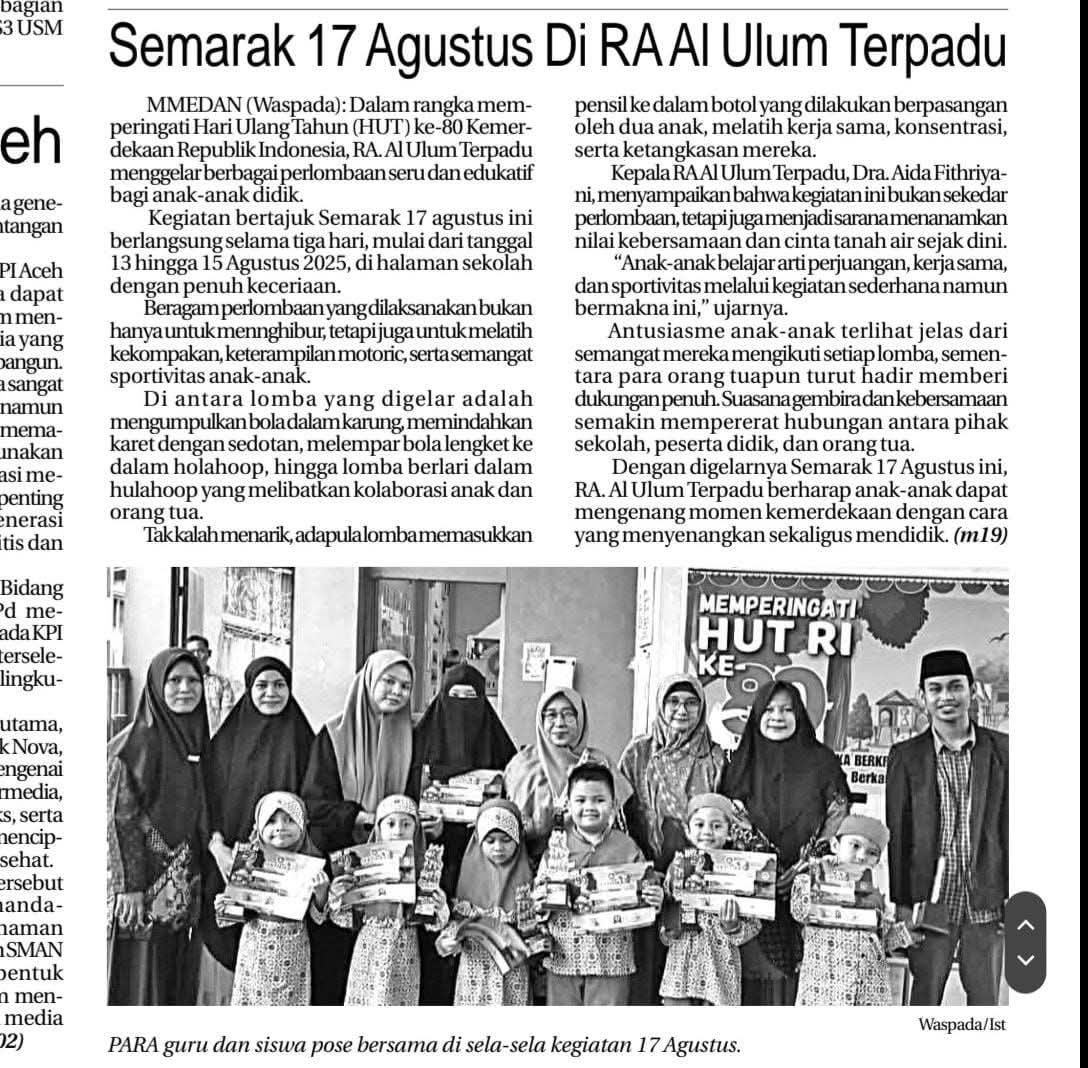 Momen membanggakan, ketika sumringah ceria terpancar dalam wajah² para juara, anak² RA. AL ULUM TERPADU MEDAN, telah terabadikan dalam harian WASPADA hari ini, Selasa/ 26 AGUSTUS 2025